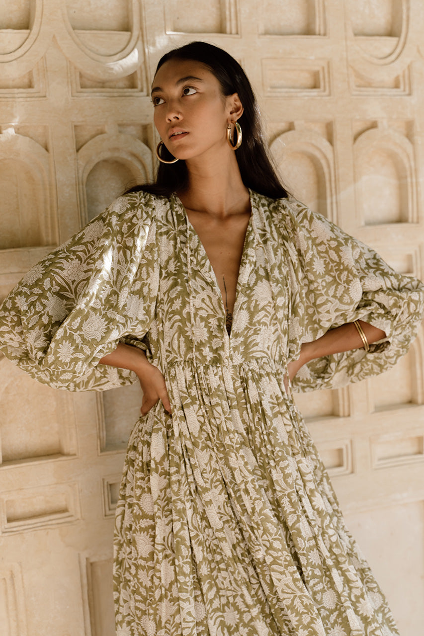 Designed with freedom to flow with ease ~ Our signature Kyra Midi Dress in a sweeping shade of mellow green. Handmade using the traditional method of block printing, an Indian artistry that has been passed down through generations.